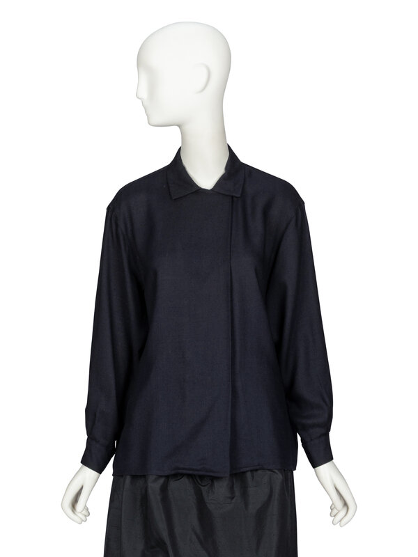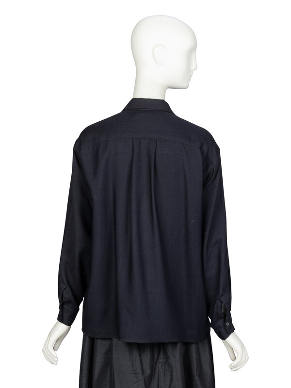 Boxy blouse in navy wool/silk-blend twill. Spread collar. Drop shoulders; full-length sleeves with buttoned shirt cuffs. Slightly displaced closure at front; single button and loop closure at neckline & two snap closures. Unlined.