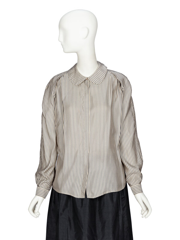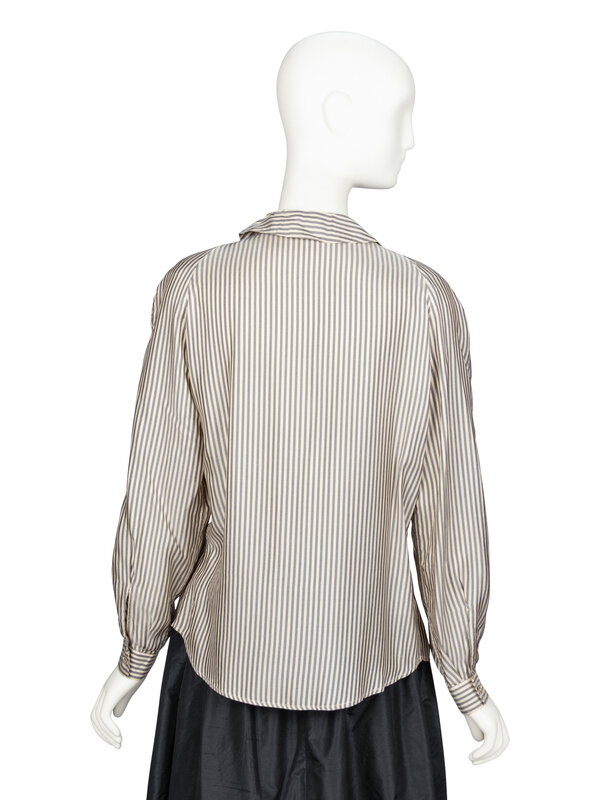 Blouse in a grey and ivory striped silk twill. Rounded collar. Light padding at shoulders. Full-length raglan-style sleeves with buttoned shirt cuffs. Concealed button closures at front. Unlined.