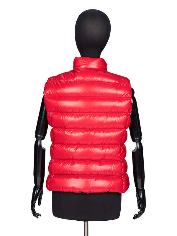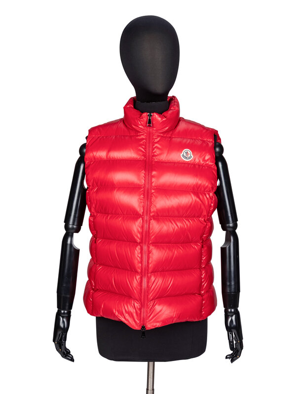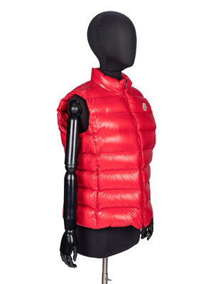 "Ghany" vest in down-filled & quilted red nylon. Stand collar. Two in-seam pockets at front with invisible zipper closures. Double-ended zipper closure at front. Fully self-lined.