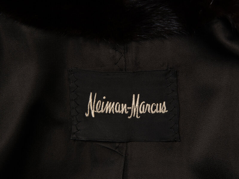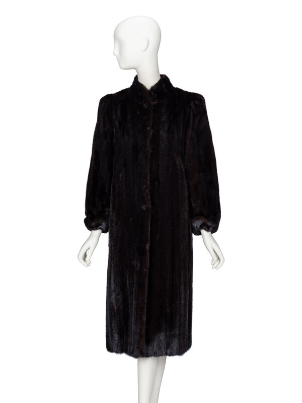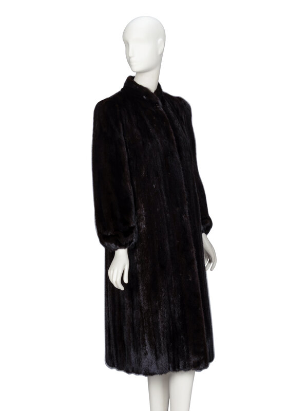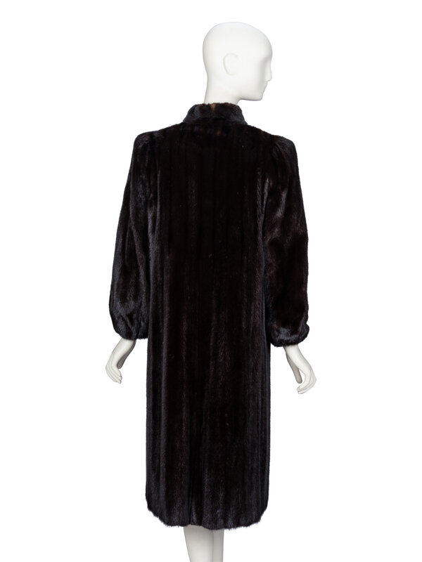 Knee-length fur coat in dark brown ranch mink fur. Stand collar. Full-length sleeves with elasticated sleeve hems. Two slit pockets at front. Three hook-and-eye closures at front. Waist ties at interior. Fully lined.