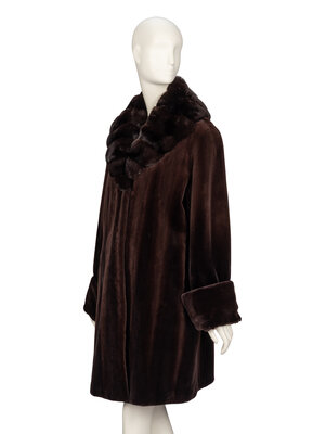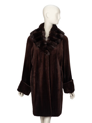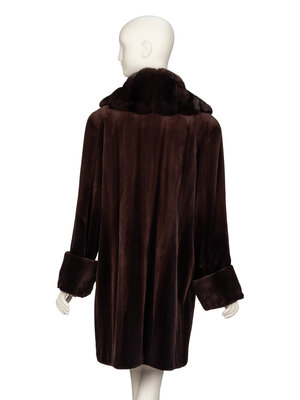 Three-quarter length coat in deep brown sheared mink fur; oversize shawl collar in deep brown marten fur. Full-length sleeves with optional turned-up cuffs. Two in-seam pockets at front. Four hook-and-eye closures at front. Fully lined.