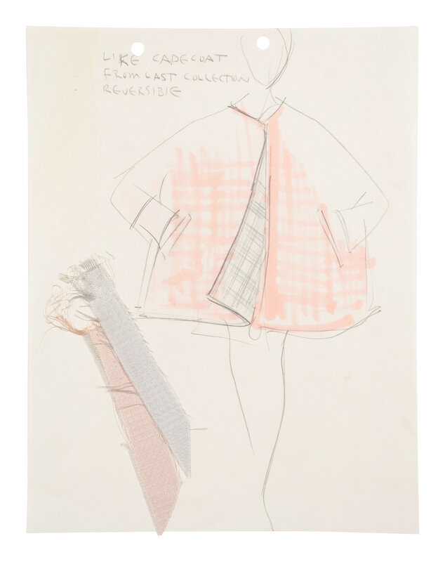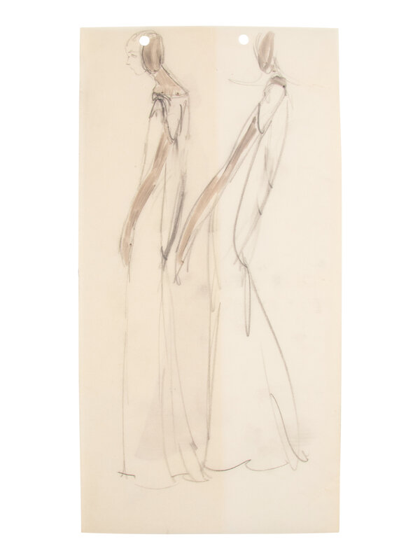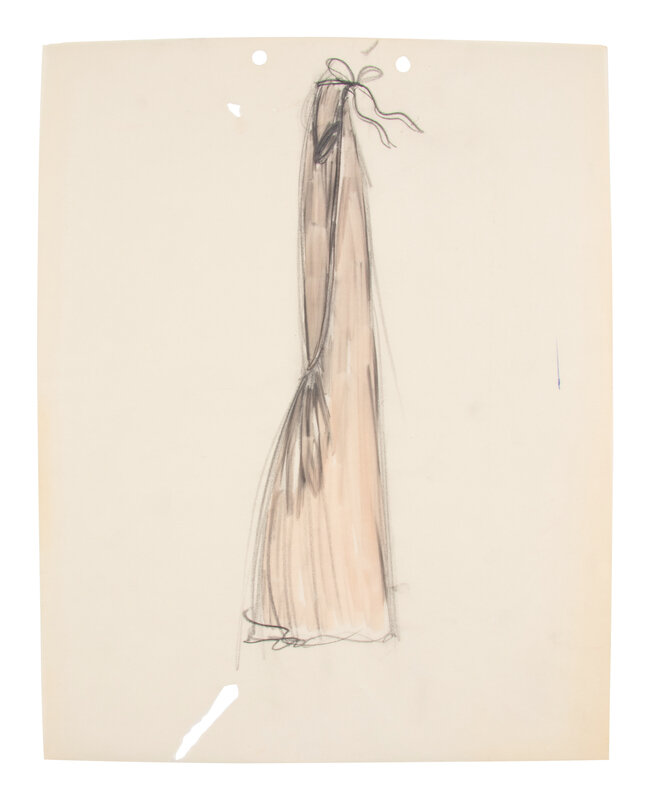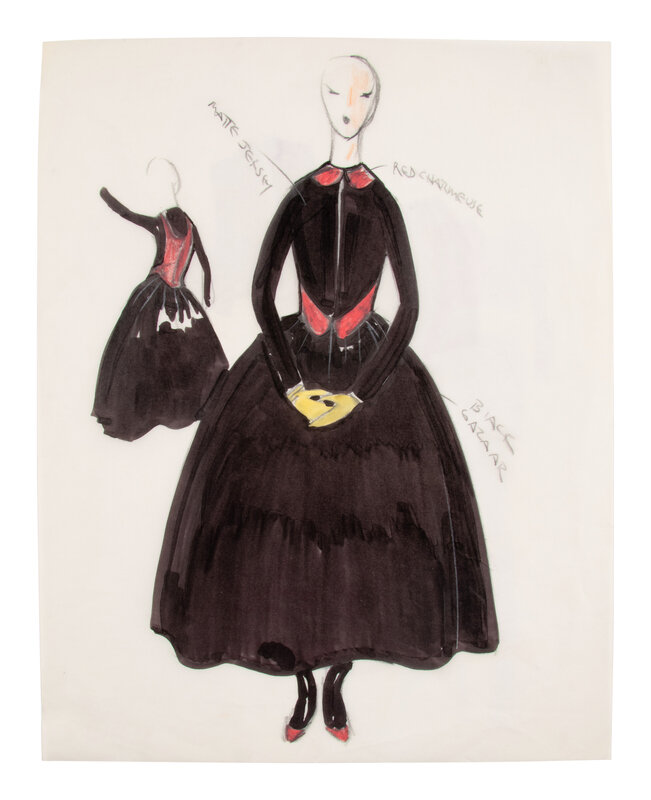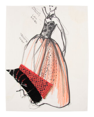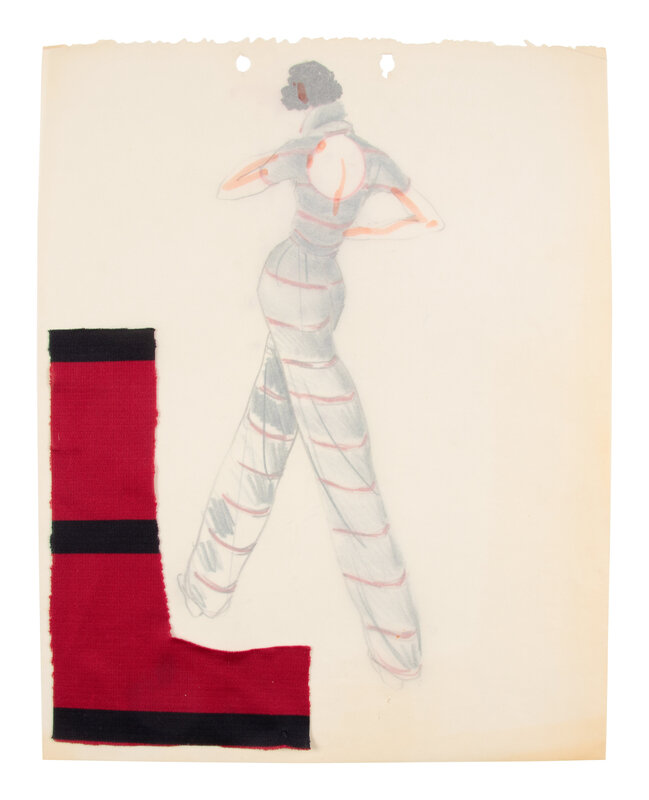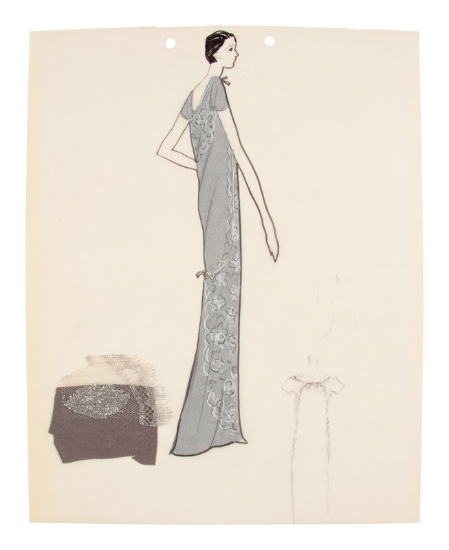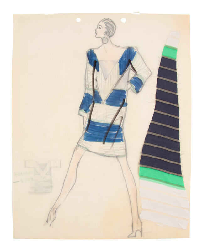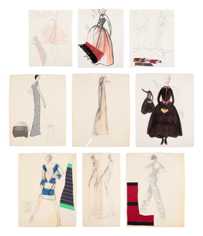 Comprised of a group of nine fashion sketches. Variety of marker, graphite, colored pencil, and ink on paper; with fabric swatches attached throughout.