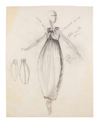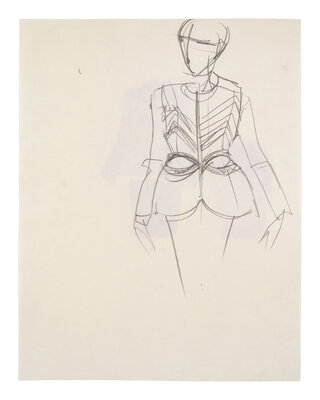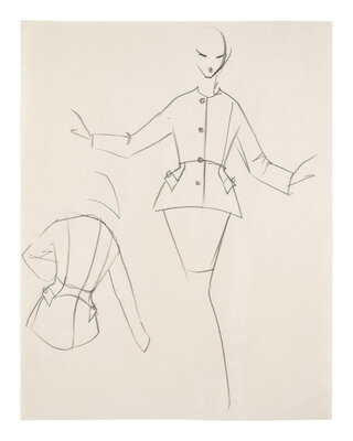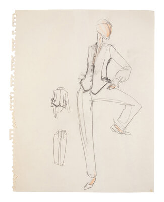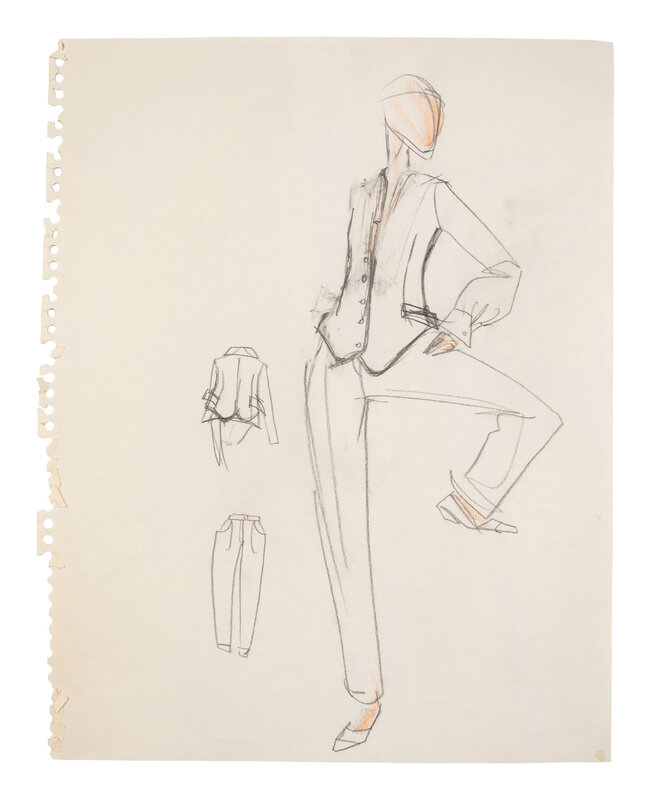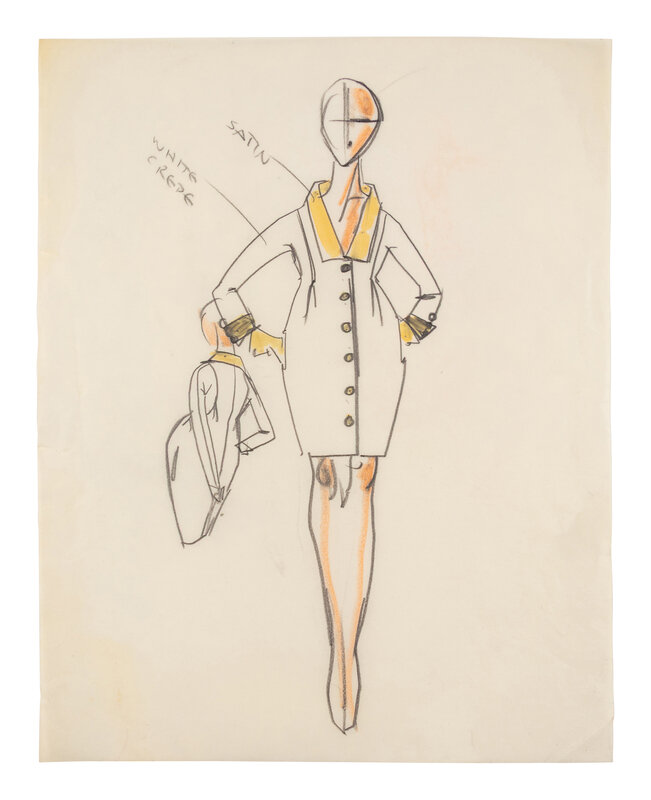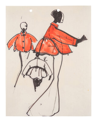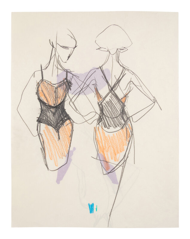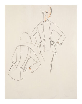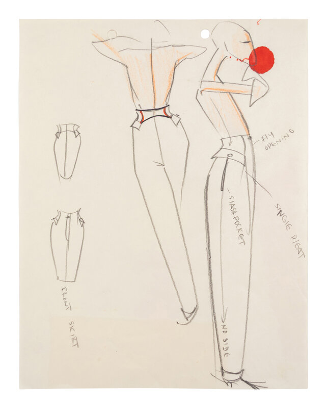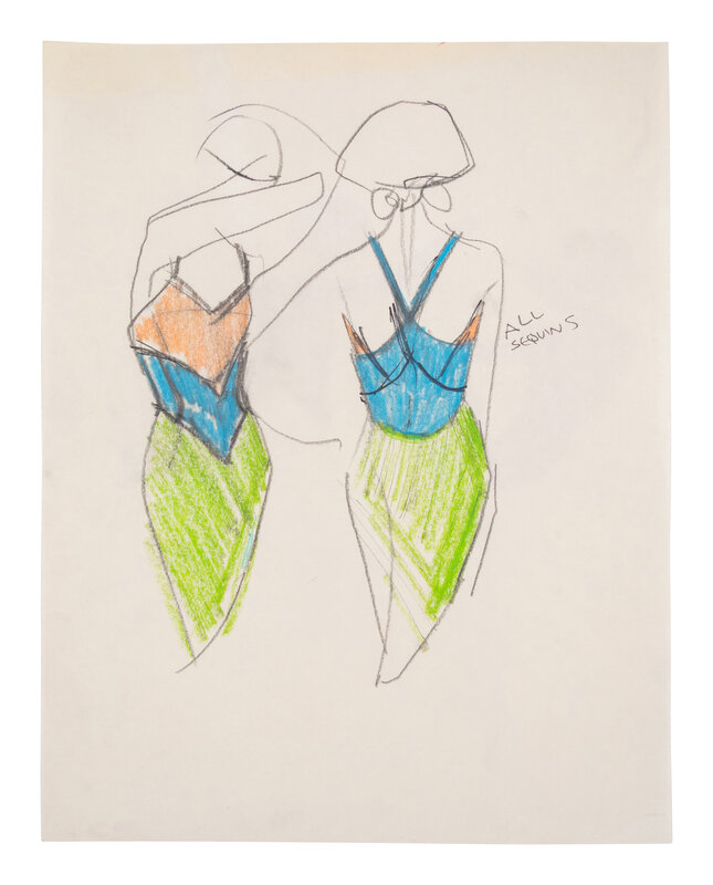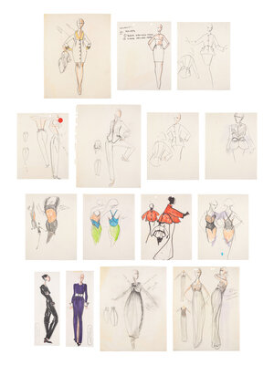 Comprised of a group of fifteen fashion sketches. Variety of marker, graphite, colored pencil, and ink on paper.