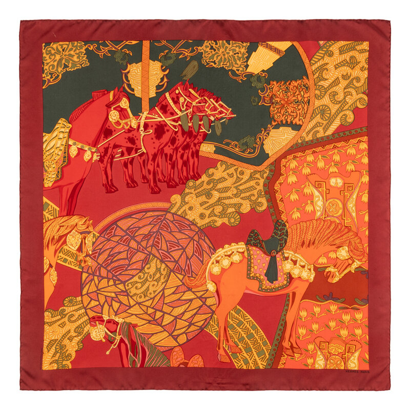 “Art des Steppes II” Scarf 90 in printed silk twill. Features rolled and hand-stitched edges.