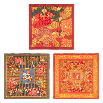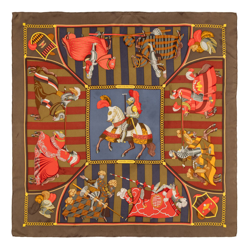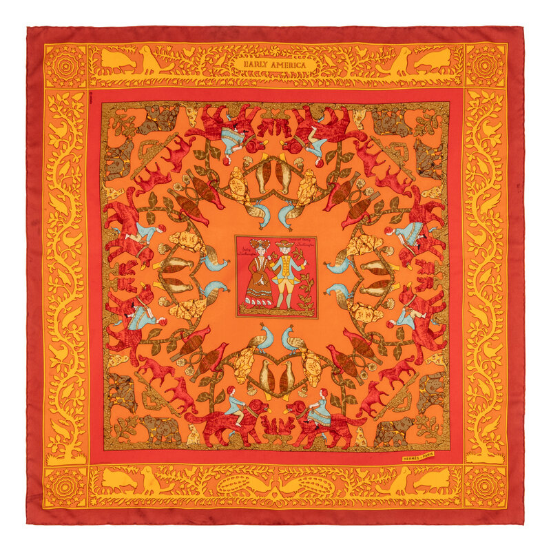 “Early America” Scarf 90 in printed silk twill. Features rolled and hand-stitched edges.