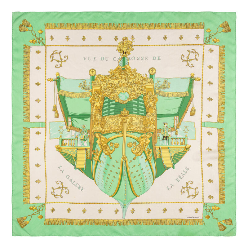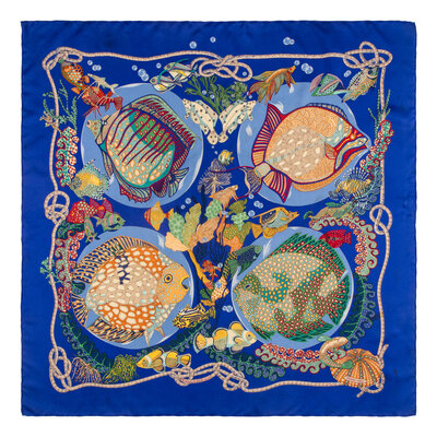 “Grands Fonds” Scarf 90 in printed silk twill. Features rolled and hand-stitched edges.