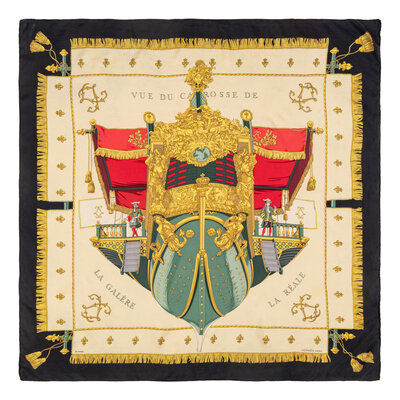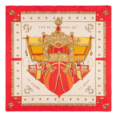 “La Réale" Scarf 90 in printed silk twill. Features rolled and hand-stitched edges.