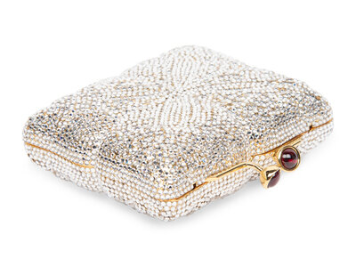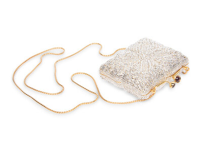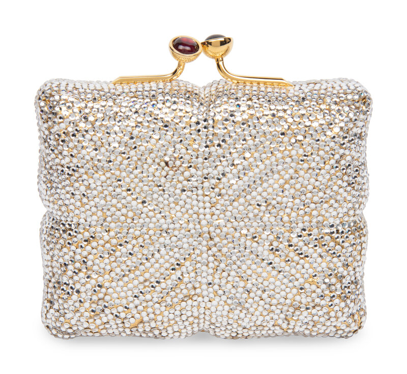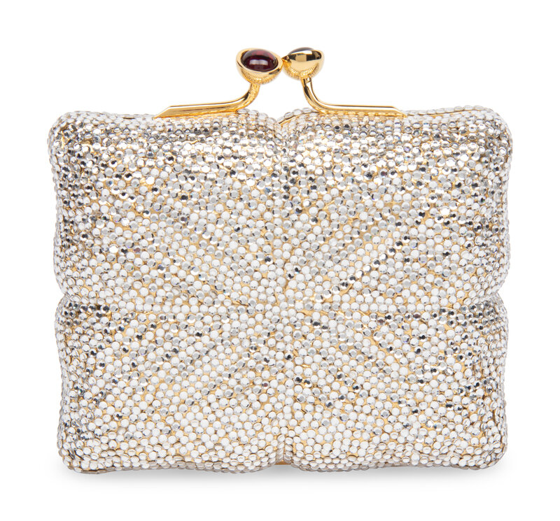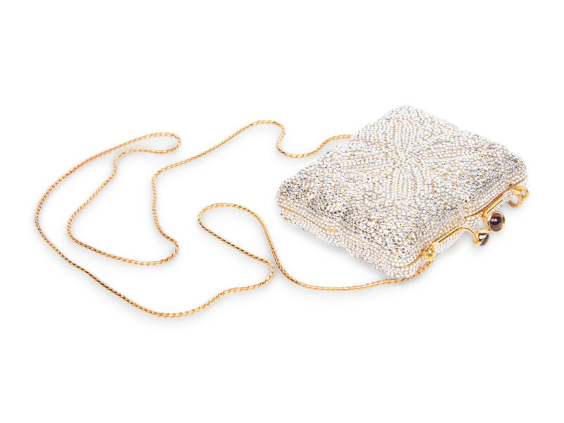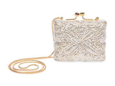 Small kiss-lock minaudière in gold-tone metal with crystal embellishments throughout exterior. Features a kiss-lock closure, retractable chain shoulder strap, and a gold-tone lambskin lining.