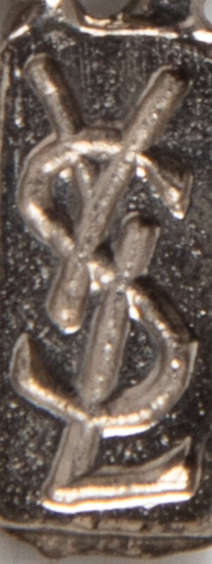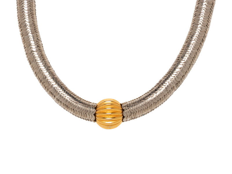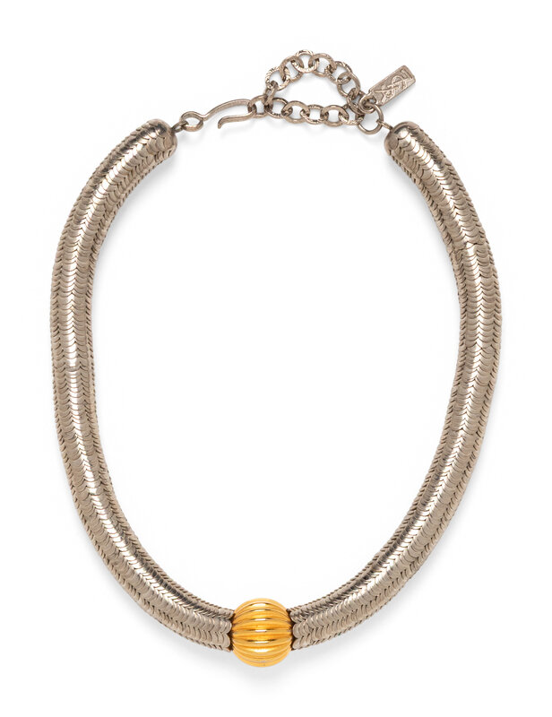 Choker necklace in a silver-tone tubular snake chain with a gold-tone metal bead. Hook and loop closure. Stamped YSL at hanging tag.