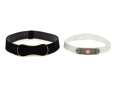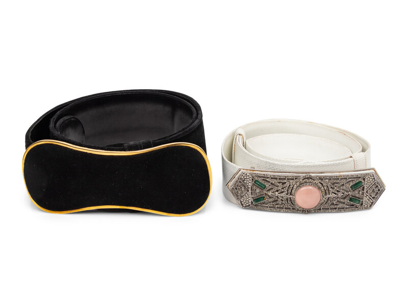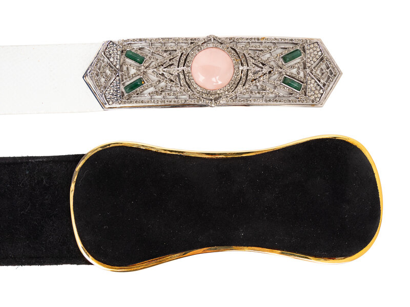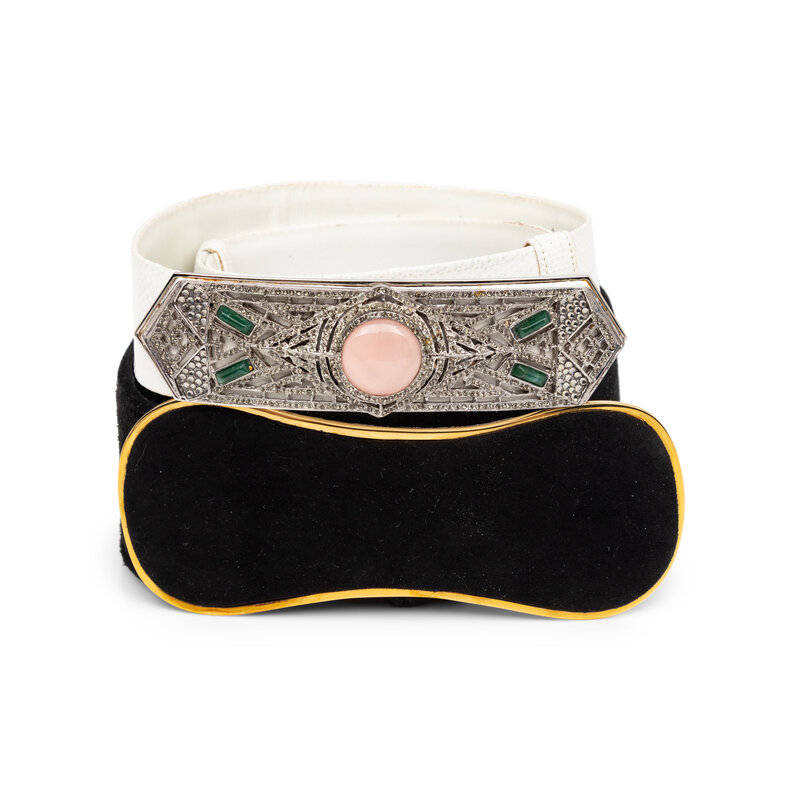 Belt in white lizard skin with silver-tone hardware and crystal-embellished buckle.