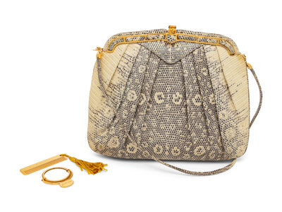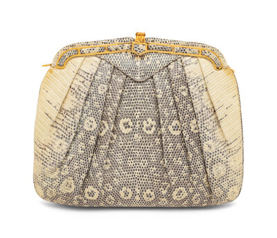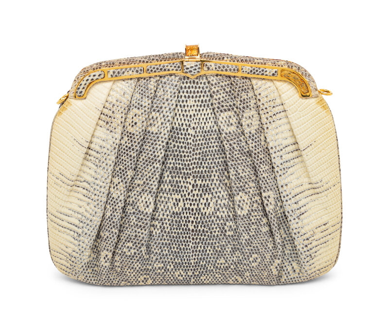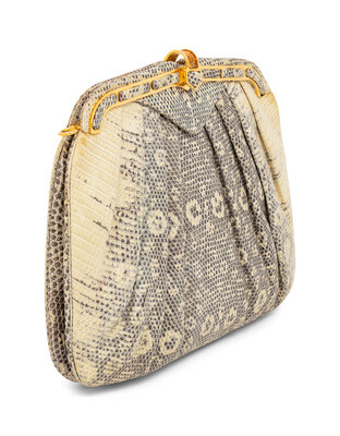 Clutch/shoulder bag in lizard skin with gold-tone hardware. Clasp closure to frame and removable python skin strap.