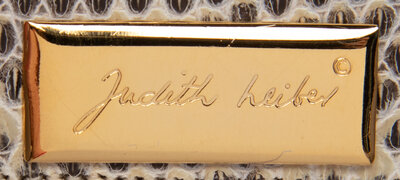 Details: Gold-tone hardware, clasp closure to frame, grey faille lining, one interior slip pocket, one interior zipper pocket