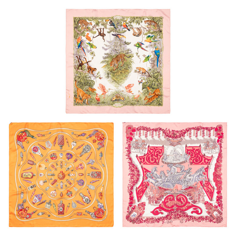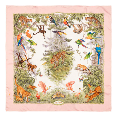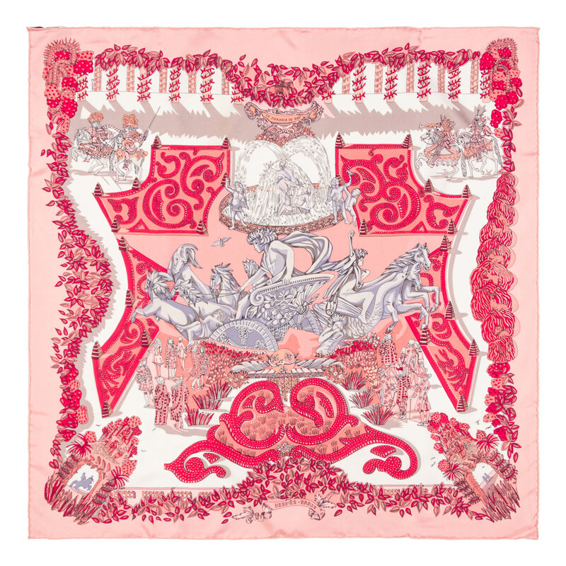 “Le Paradis du Roy” Scarf 90 in printed silk twill. Features rolled and hand-stitched edges.