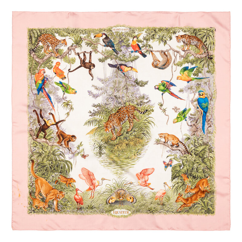 “Équateur” Scarf 90 in printed silk twill. Features rolled and hand-stitched edges.