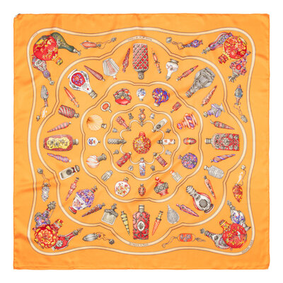 “Flacons” Scarf 90 in printed silk twill. Features rolled and hand-stitched edges.
