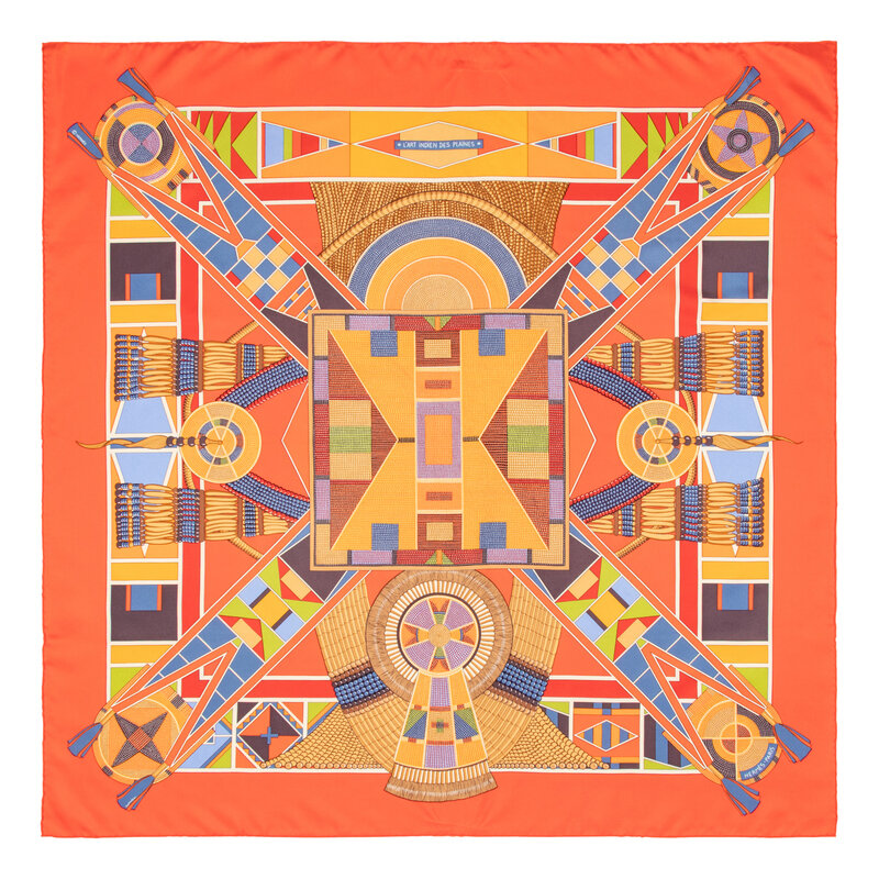 “L'Art Indien des Plaines” Scarf 90 in printed silk twill. Features rolled and hand-stitched edges.