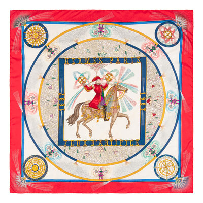 “Feux d'Artifice” Scarf 90 in printed silk twill. Features rolled and hand-stitched edges.