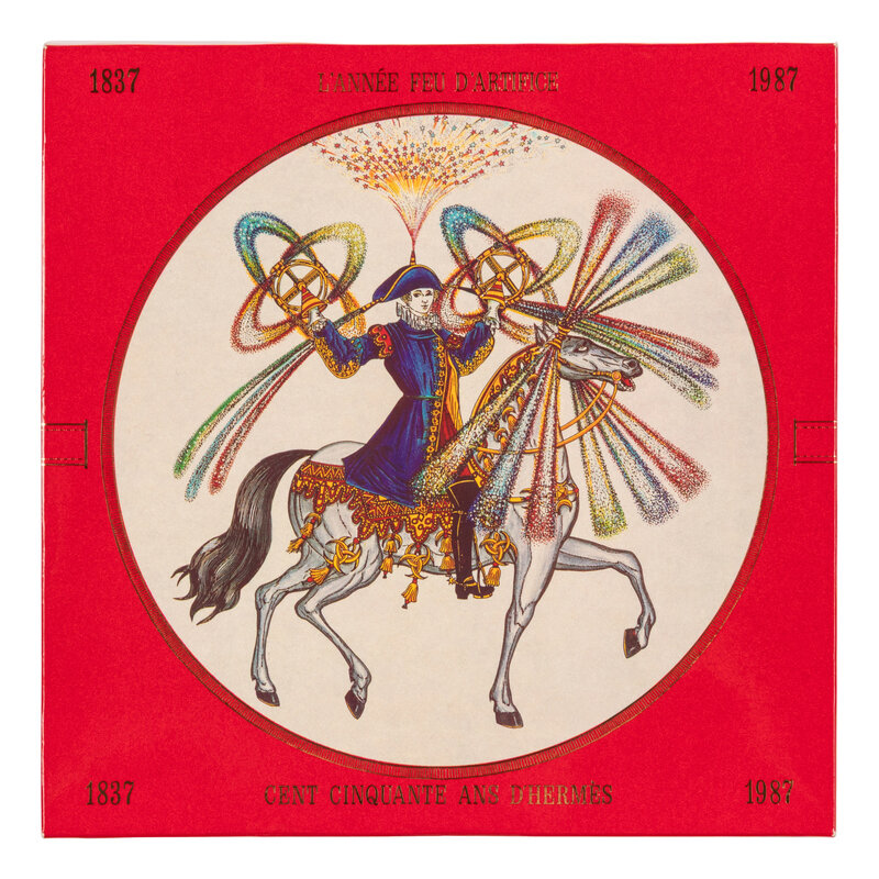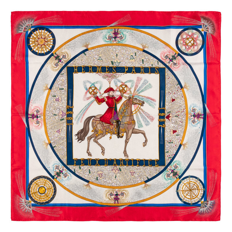 “Feux d'Artifice” Scarf 90 in printed silk firework-pattern jacquard. Features rolled and hand-stitched edges. Includes box & commemorative slipcover for box.