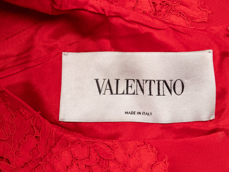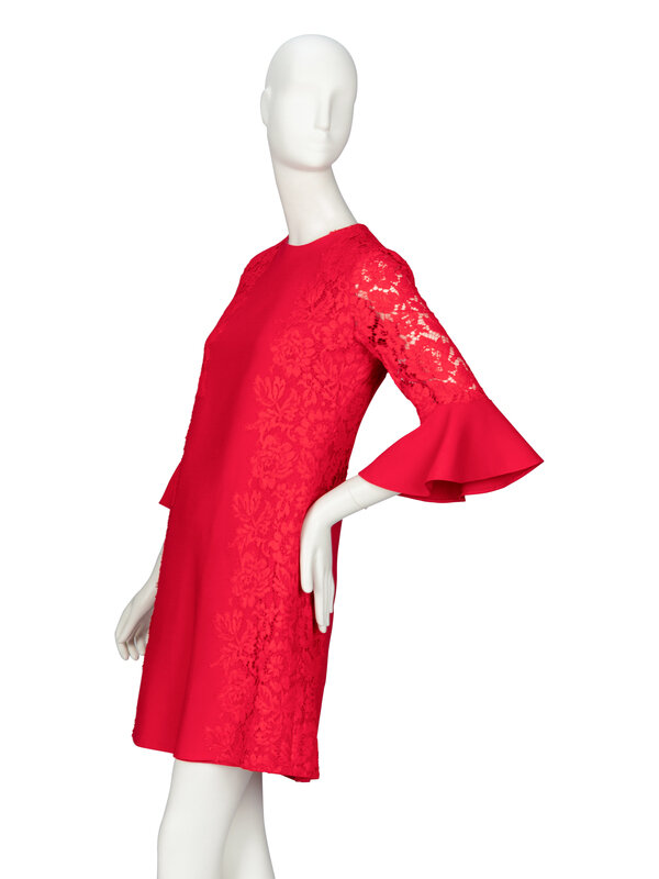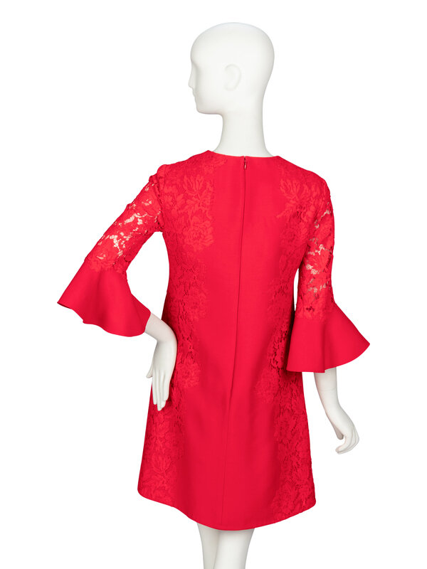Shift dress in red wool/silk-blend crêpe with tonal lace appliqués throughout. Round collarless neckline. Elbow-length sheer lace sleeves with flared flounce at elbow. Slight A-line silhouette to dress; above-knee length skirt. Invisible zipper closure at back. Fully lined.