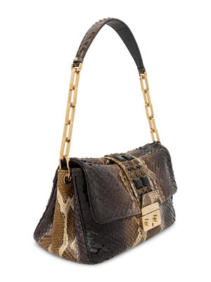 Handbag in python skin with rhinestone/metal stud embellishments. Push-lock closure and metal chain & leather strap.