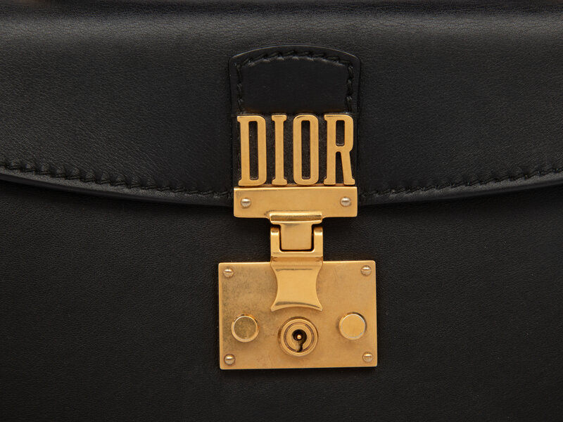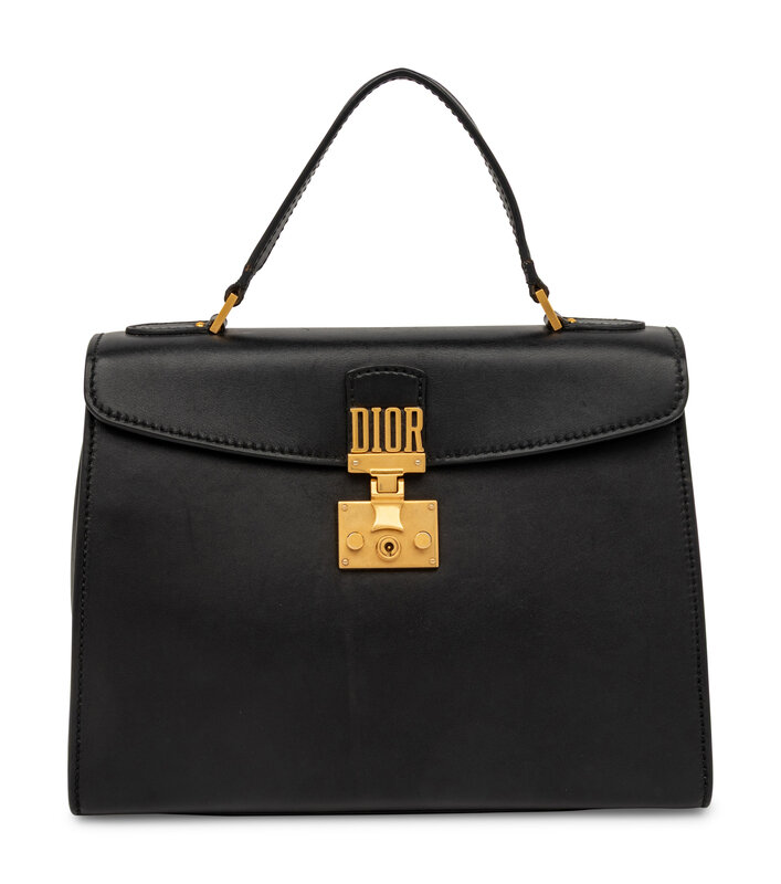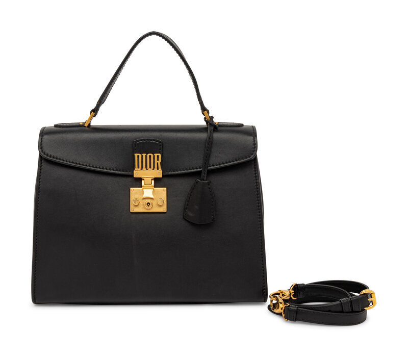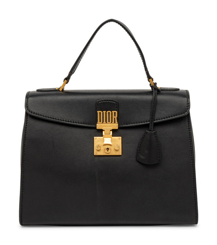 DiorAddict top handle bag in smooth black calfskin leather. Push-lock closure, top handle, and removable flat leather shoulder strap.