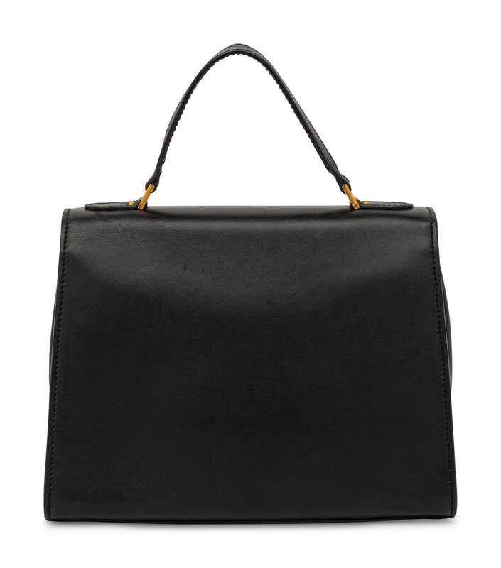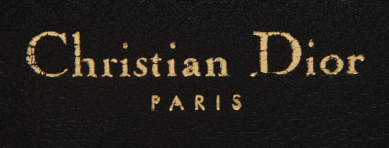Details: Aged gold-tone hardware, push-lock closure, black suede lining, one interior zipper pocket, one interior slip pocket, metal protective feet at base