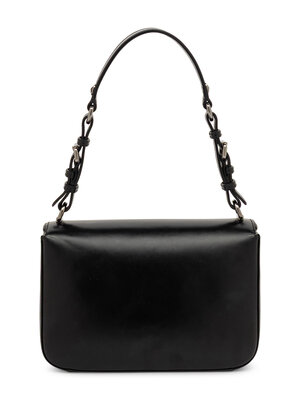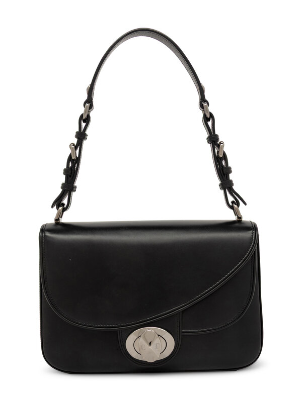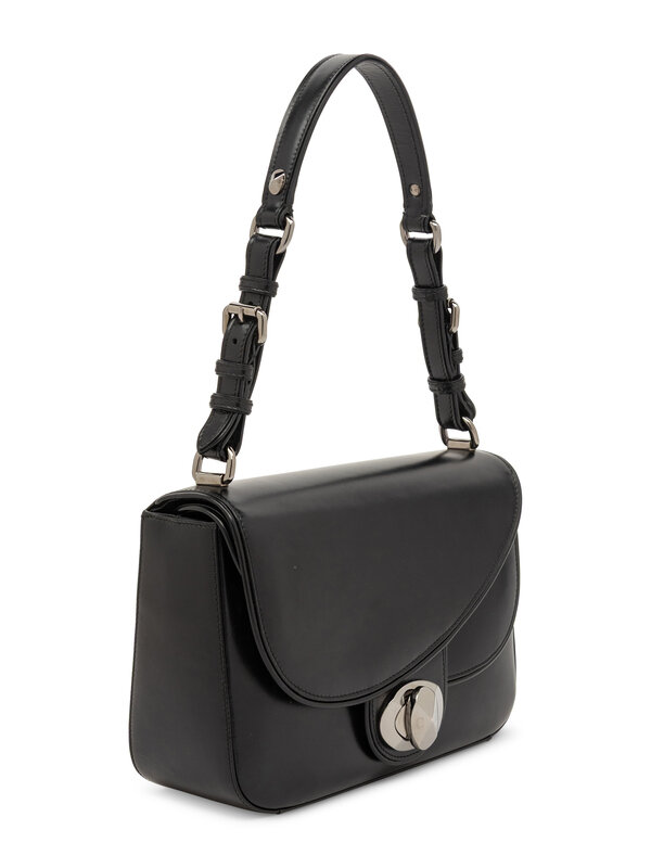 3D double flap handbag in smooth black calfskin leather. Turn-lock closure and adjustable flat black leather handle.