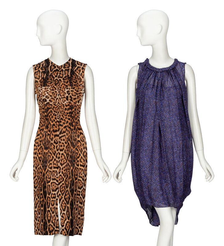 Sleeveless sheath dress in all-over jaguar-print silk chiffon. Round collarless neckline. Two patch pockets at chest. Twenty-two hook-and-eye closures at front. Unlined.
