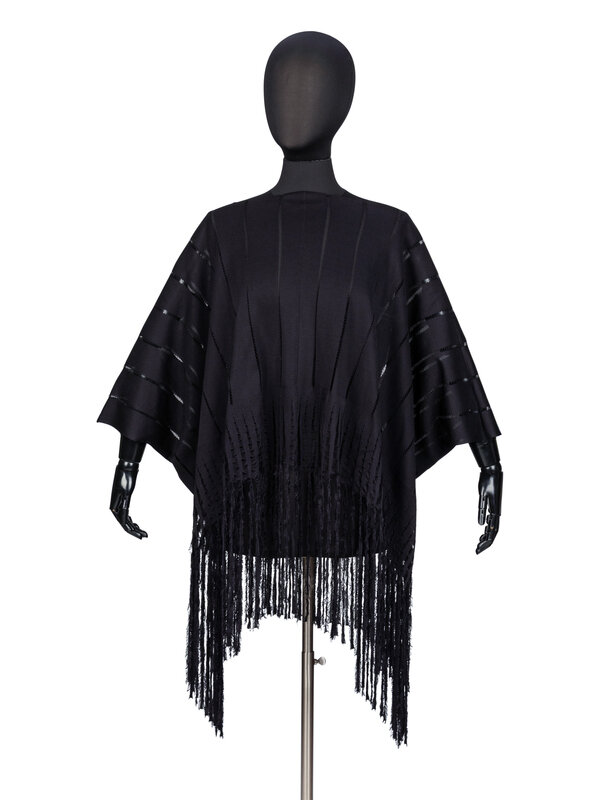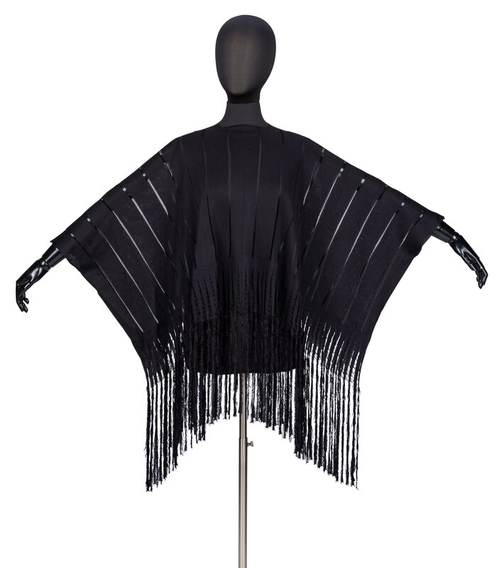 Fringed poncho in black silk knit jersey. Wide flat neckline. Three-quarter-length sleeves. Laddering throughout bodice; extends into frayed fringe at hem. Unlined.