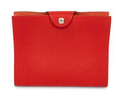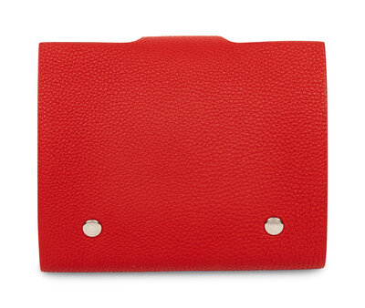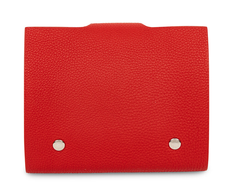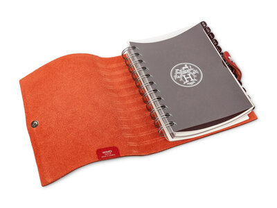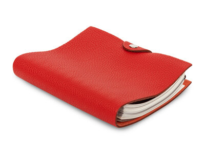Leather-covered address book/notebook in burnt umber Togo leather with Clou de Selle metal snap closure.