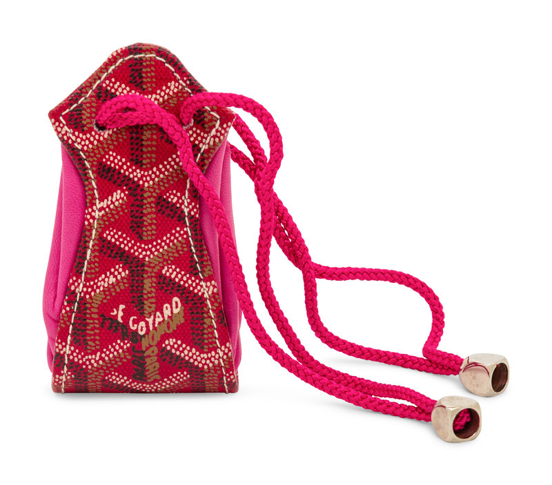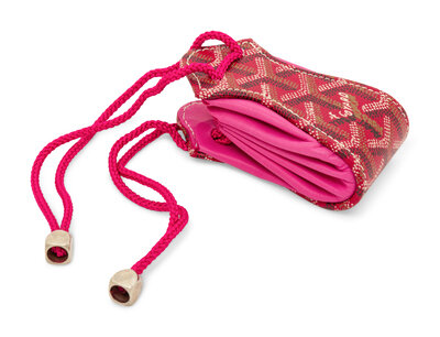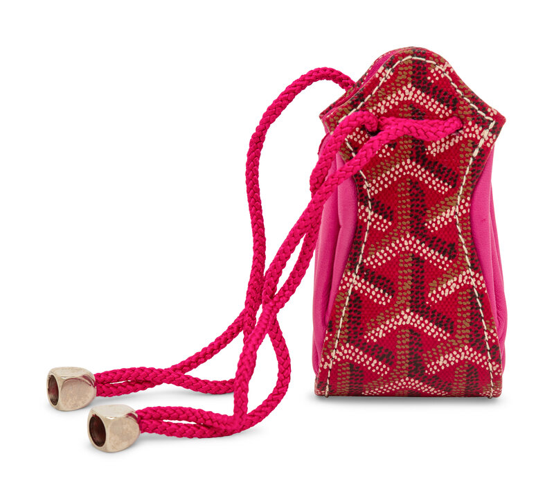 Accordion-style coin pouch in painted red Goyardine canvas and pink leather. Drawstring closure with pink cord straps.