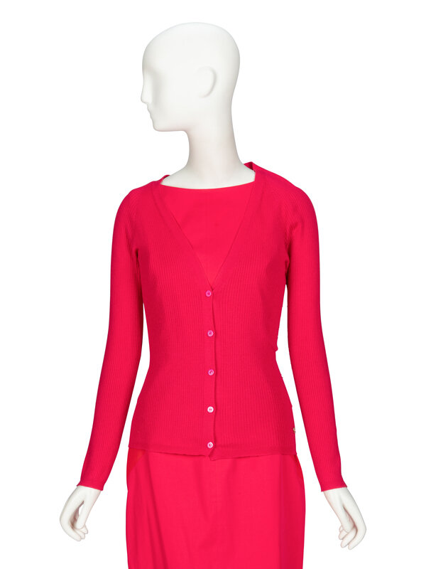 Cardigan in hot pink ribbed knit; likely cashmere. V neckline. Full-length slim sleeves. Tonal button closures at front. Unlined.