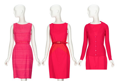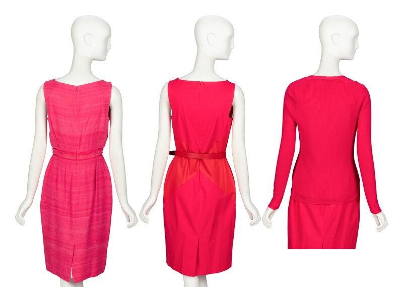 Sleeveless sheath dress in hot pink & red stretch-blend cotton twill. Geometric paneling throughout. Wide bateau neckline. Fitted bodice and waist; thread belt loops at waist side seams with removable red leather belt. Knee-length straight skirt with kick pleat at center back hemline. Invisible zipper closure at back. Fully lined.