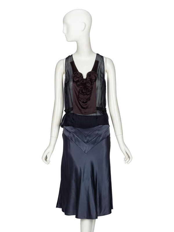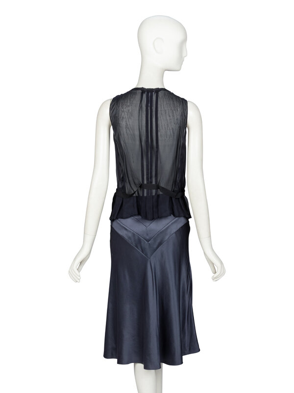 Sleeveless blouse in sheer navy silk chiffon with a black silk charmeuse panel & rosette details at front. V-neckline. Pleats at center back. Black grosgrain attached belt at waist. Invisible zipper closure at side bodice. Unlined.