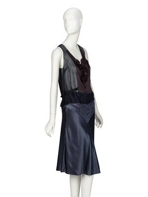 Below-knee-length flared skirt in steel grey silk charmeuse. V-shaped insets at front & back. Partially bias-cut. Invisible zipper closure at side waist. Fully lined.