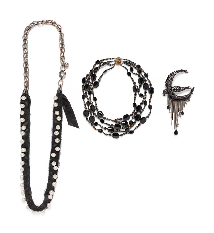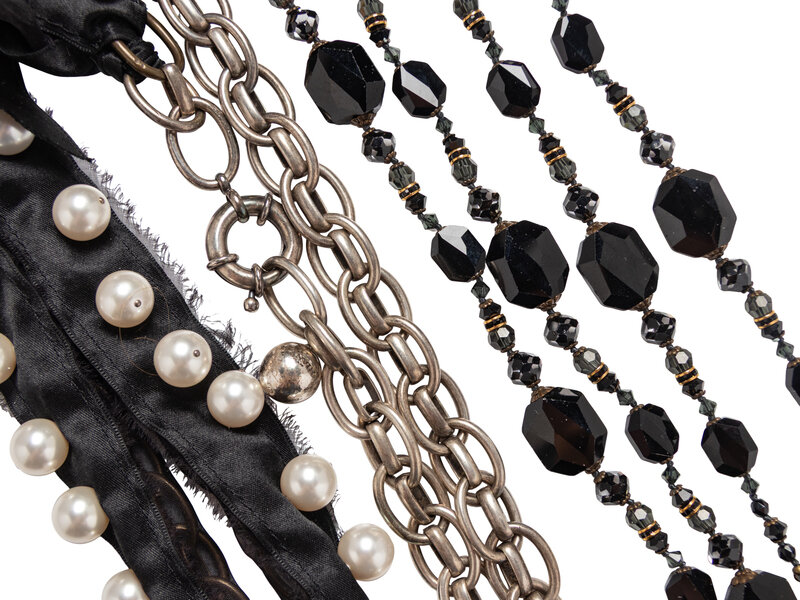Chain-link necklace in aged silver-tone metal, partially wrapped in black organza & ribbon with faux-pearl beads. Jump ring closure. Stamped Lanvin / Made in France at closure.