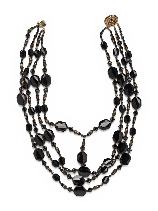 Layered multi-strand necklace in black faceted stones, glass beads, and gold-tone metal. Box clasp closure. Unsigned.