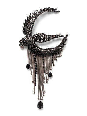 Bird-motif brooch in silver-tone metal with black rhinestone settings and dangling trim. Standard pin backing. Unstamped. With original box & dust bag.