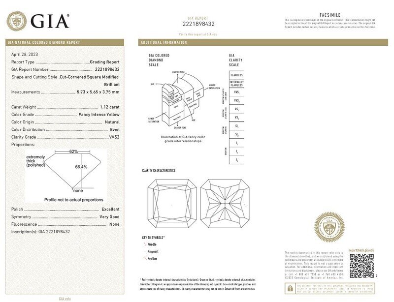 GIA, 2023, Report No. 2221898432, 1.12 carat, Natural Fancy Intense Yellow color, VVS2 clarity, No fluorescence