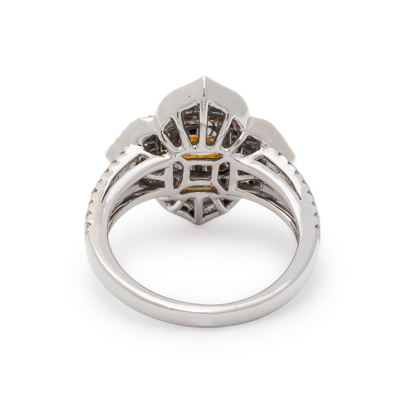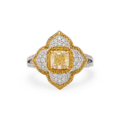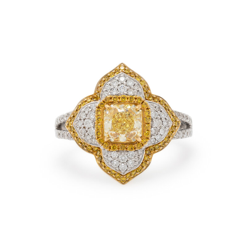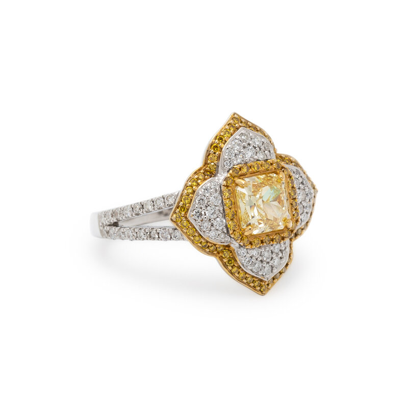 In a quatrefoil design featuring a Fancy Intense Yellow radiant cut diamond weighing 1.12 carats at the center, the quadrants and shank pavé-set with round diamonds weighing approximately 0.45 carat total and round yellow diamonds (origin of color not tested) weighing approximately 0.25 carat total. Mounted in 18 karat white and yellow gold. Ring size 7.