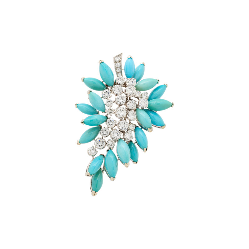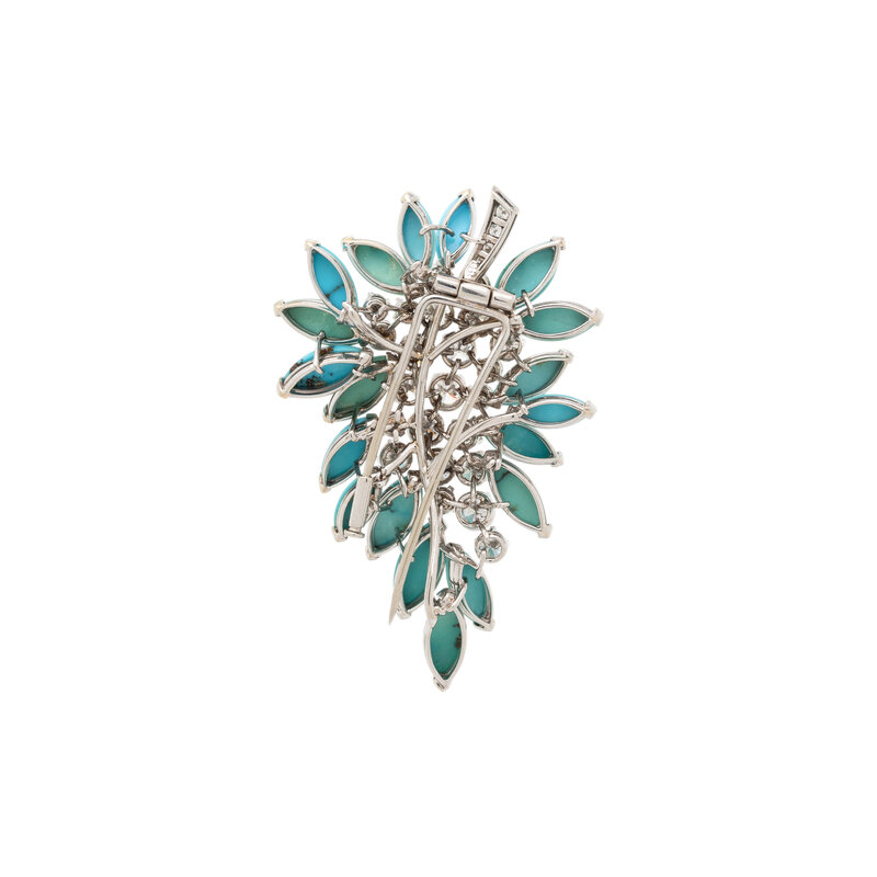 In a foliate design, the central element and stem set with round diamonds weighing approximately 5.30 carats total, surrounded by a spray of marquise cabochon cut turquoise. Mounted in 18 karat white gold. 2 1/2 x 1 5/8 inches.