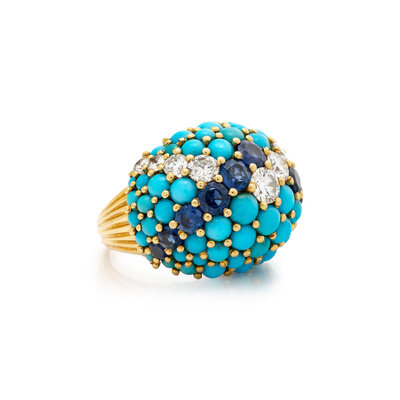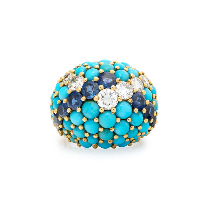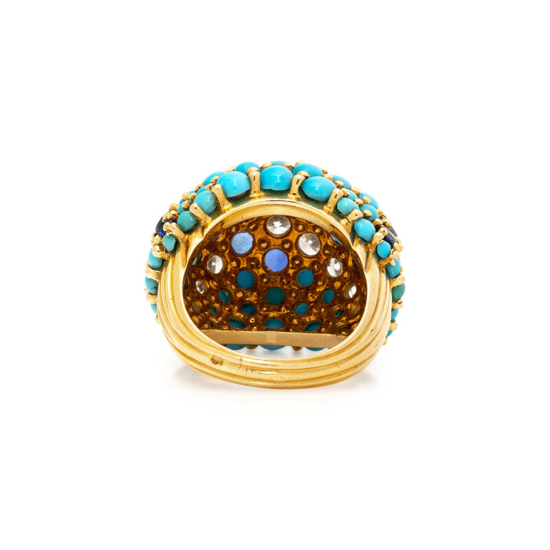 In a bombé style, set with round diamonds weighing approximately 2.25 carats total, round sapphires, and round cabochon turquoise. Mounted in 18 karat yellow gold. Ring size 6 1/2.
