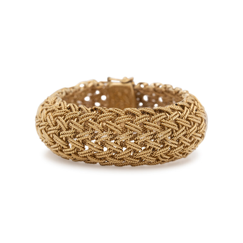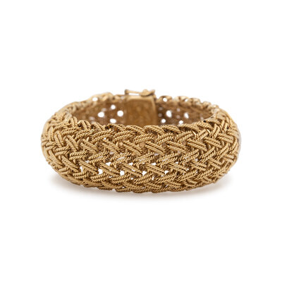 Textured gold in a braided design. 14 karat yellow gold. 7 3/4 inches long, 7/8 inch wide.