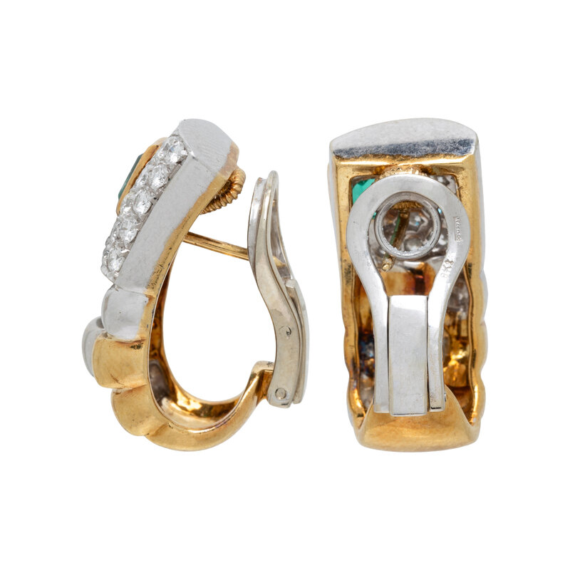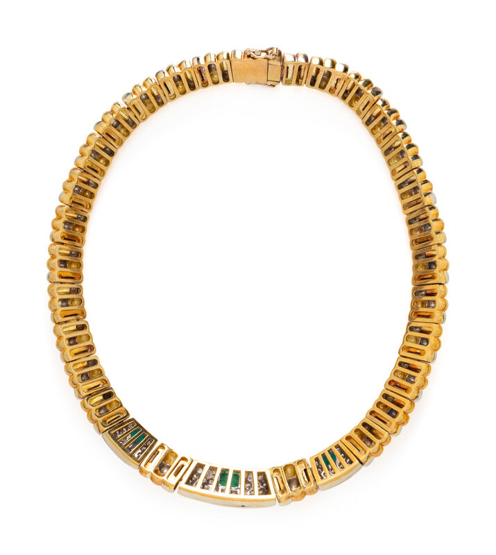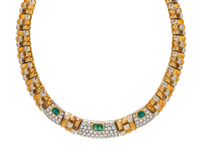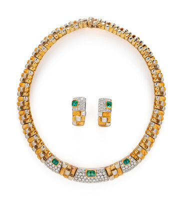 BICOLOR GOLD, EMERALD, AND DIAMOND NECKLACE AND EARRINGS