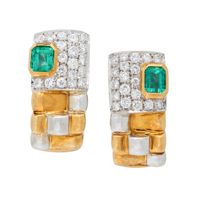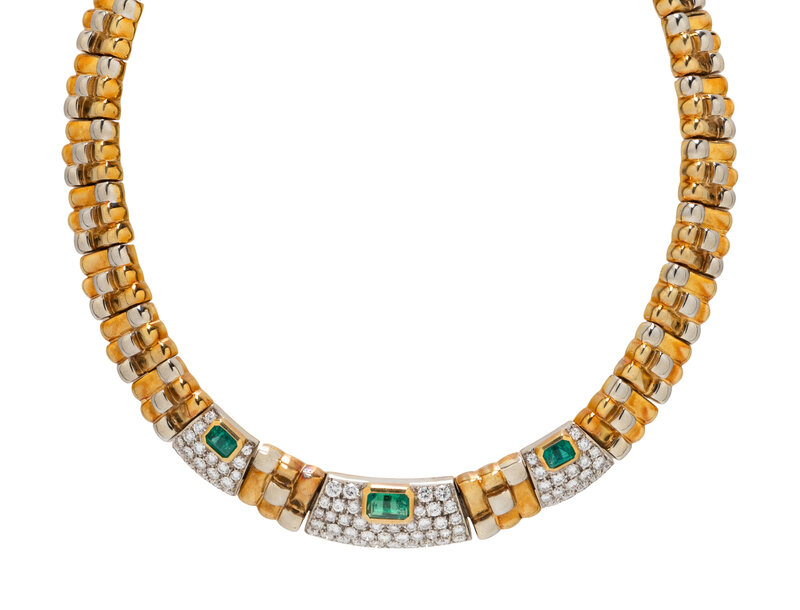 The necklace designed with bicolor gold checkerboard links and featuring three plaques set with emerald cut emeralds and round diamonds weighing approximately 3.45 carats total, with a matching pair of earrings set with emerald cut emeralds and round diamonds weighing approximately 0.85 carat total. Mounted in 18 karat yellow and white gold. Necklace: 14 inches long. Earrings: 7/8 inch long.