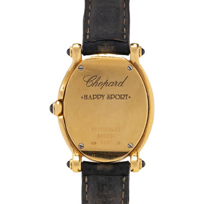Stamps: Case back: Chopard HAPPY SPORT 27/7000-23 960634 5291 750 (Swiss hallmarks). Buckle: Chopard 750.