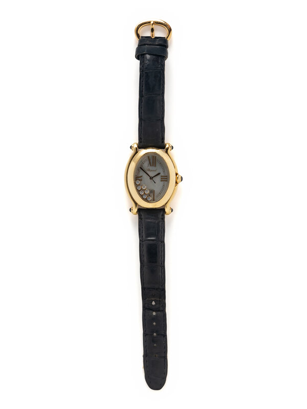 Bracelet/Strap: Black leather with 18K yellow gold Chopard buckle