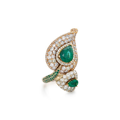 Depicting a pair of leaves, set with two pear shaped emeralds measuring approximately 7.00 x 4.75 mm and 10.95 x 8.25 mm, round emeralds, and natural pink, natural green, and white round diamonds weighing approximately 4.75 carats total. Yellow gold. Ring size 6.