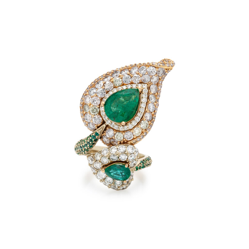 EMERALD, COLORED DIAMOND, AND DIAMOND BYPASS LEAF RING
