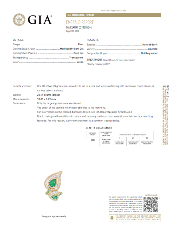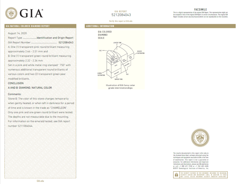 GIA, 2020, Report No. 5212084043, A & B pink and green diamonds, Natural Diamonds, Natural Color, Stone B: "CHAMELEON" color changes temporarily when gently heated, or when left in darkness for a period of time